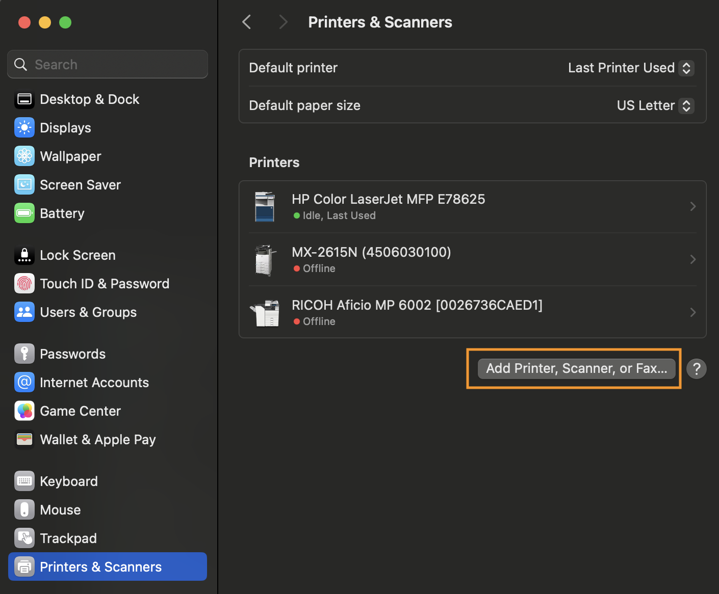 2. On the left side of the window, scroll down to Printers and Scanners. Then click on Add Printer.